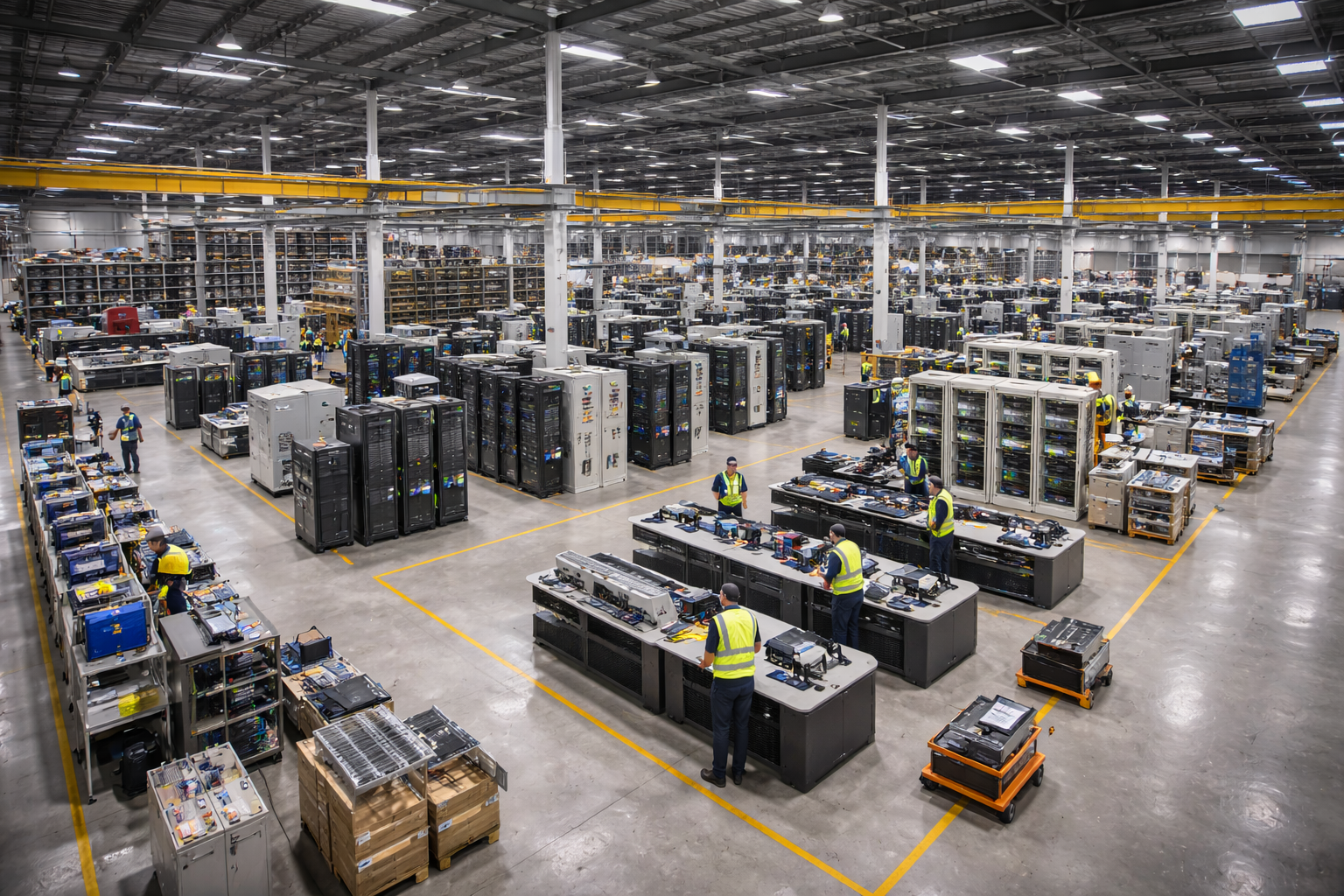 Modular E-House construction using structural steel frames, complete with internal electrical fit-out, HVAC, lighting, and fire suppression in a factory-controlled environment.